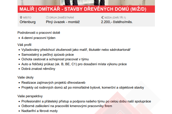 | MALÍŘ | OMÍTKÁŘ - STAVBY DŘEVĚNÝCH DOMŮ (M/Ž/D) | Povolání bez oboru a mezioborová | Ortenburg | Hlavní pracovní poměr | Více |