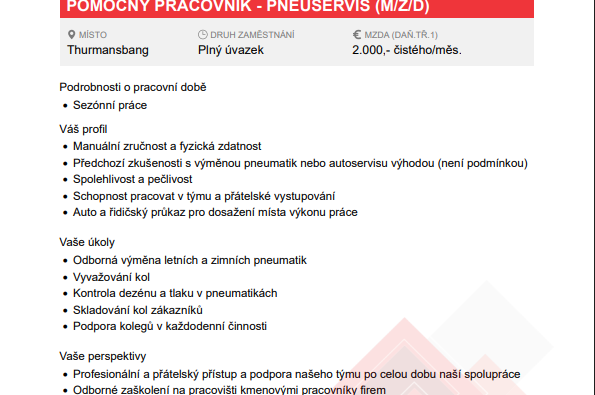 | POMOCNÝ PRACOVNÍK - PNEUSERVIS (M/Ž/D) | Povolání bez oboru a mezioborová | Thurmansbang | Hlavní pracovní poměr | Více |