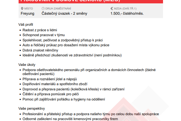 | PRACOVNÍK V DOMOVĚ SENIORŮ (M/Ž/D) | Služby provozní a osobní | Freyung | Hlavní pracovní poměr | Více |