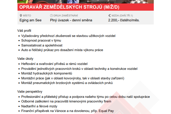 | OPRAVÁŘ ZEMĚDĚLSKÝCH STROJŮ (M/Ž/D) | Strojírenství a automobilový průmysl | Eging am See | Hlavní pracovní poměr | Více |