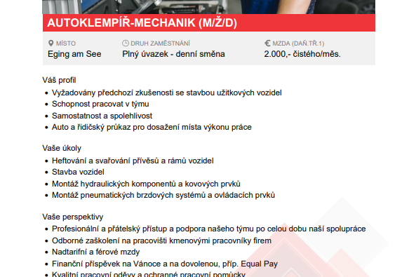 | AUTOKLEMPÍŘ-MECHANIK (M/Ž/D) | Strojírenství a automobilový průmysl | Eging am See | Hlavní pracovní poměr | Více |