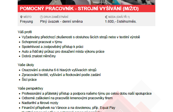 | POMOCNÝ PRACOVNÍK - STROJNÍ VYŠÍVÁNÍ (M/Ž/D) | Povolání bez oboru a mezioborová | Freyung | Hlavní pracovní poměr | Více |
