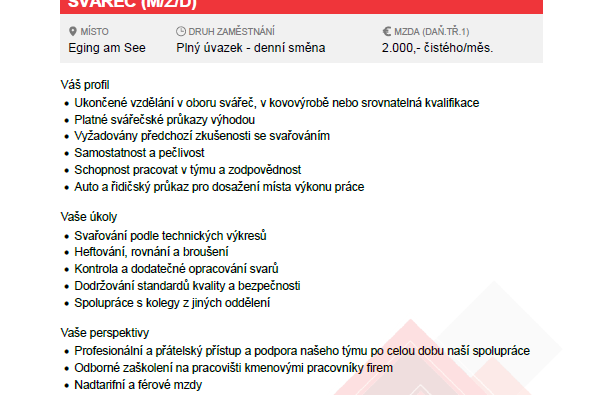 | SVÁŘEČ (M/Ž/D) | Strojírenství a automobilový průmysl | Eging am See | Hlavní pracovní poměr | Více |