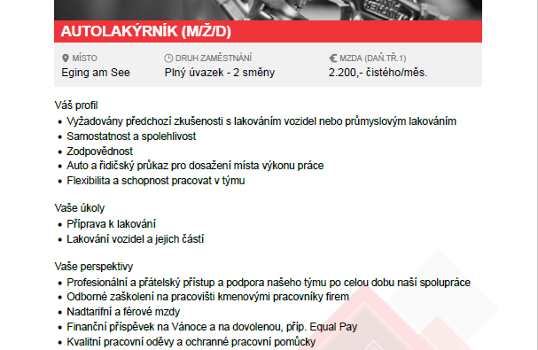 | AUTOLAKÝRNÍK (M/Ž/D) | Povolání bez oboru a mezioborová | Eging am See | Hlavní pracovní poměr | Více |