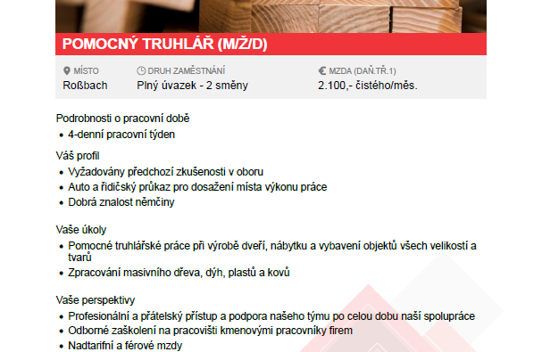 | POMOCNÝ TRUHLÁŘ (M/Ž/D) | Dřevařská výroba a nábytkářství | Roßbach | Hlavní pracovní poměr | Více |