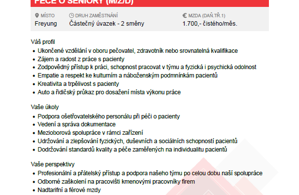 | PÉČE O SENIORY (M/Ž/D) | Služby provozní a osobní | Freyung | Hlavní pracovní poměr | Více |