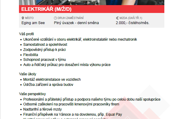 | ELEKTRIKÁŘ (M/Ž/D) | Elektrotechnika | Eging am See | Hlavní pracovní poměr | Více |