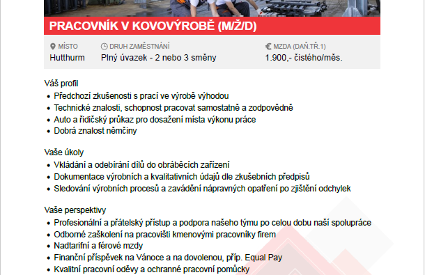 | PRACOVNÍK V KOVOVÝROBĚ (M/Ž/D) | Strojírenství a automobilový průmysl | Büchlberg | Hlavní pracovní poměr | Více |