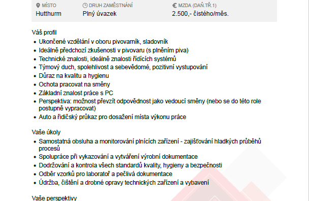 | PRACOVNÍK V PIVOVARU | SLADOVNÍK (M/Ž/D) | Povolání bez oboru a mezioborová | Hutthurm | Hlavní pracovní poměr | Více |