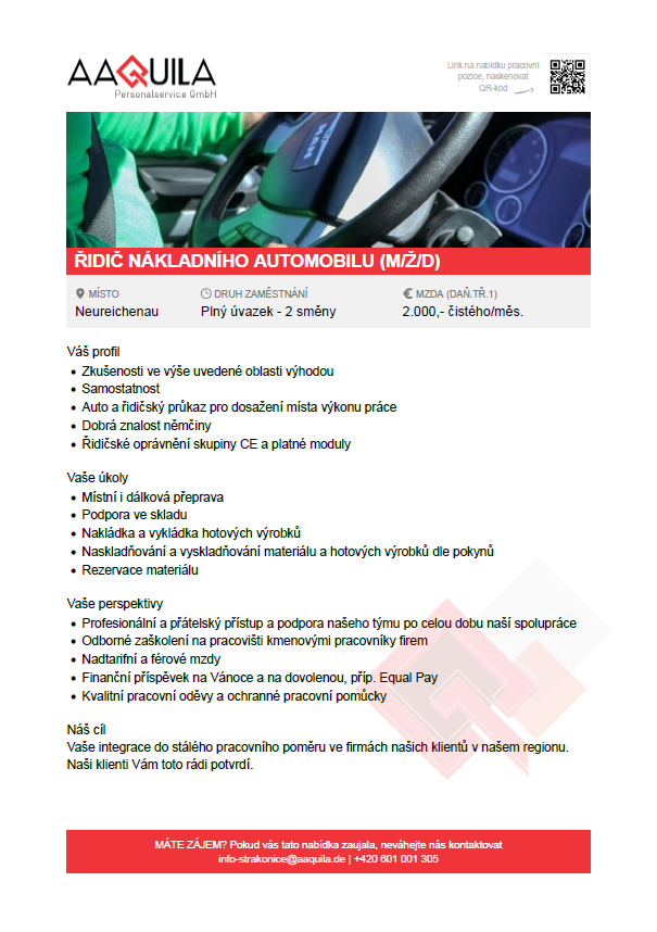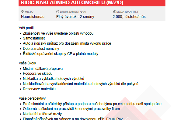 | ŘIDIČ NÁKLADNÍHO AUTOMOBILU (M/Ž/D) | Povolání bez oboru a mezioborová | Neureichenau | Hlavní pracovní poměr | Více |