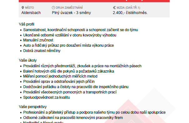 Láká Vás práce v Německu? Táhne Vás do zahraničí vidina vyššího výdělku? Chcete čerpat řadu výhod práce v Německu, ale bojíte se sami podniknout první kroky? Nechte to na nás. Připravíme pracovní smlouvy, zajistíme pojištění, a ještě s Vámi půjdeme první den do práce. Veškerá komunikace s námi probíhá v českém jazyce. Společně jsem za více než 50 let na trhu zprostředkovali tisíce pracovních pozic po celém východním Bavorsku. Naší odměnou jsou spokojení zaměstnanci, kteří konečně našli práci, kterou hledali.